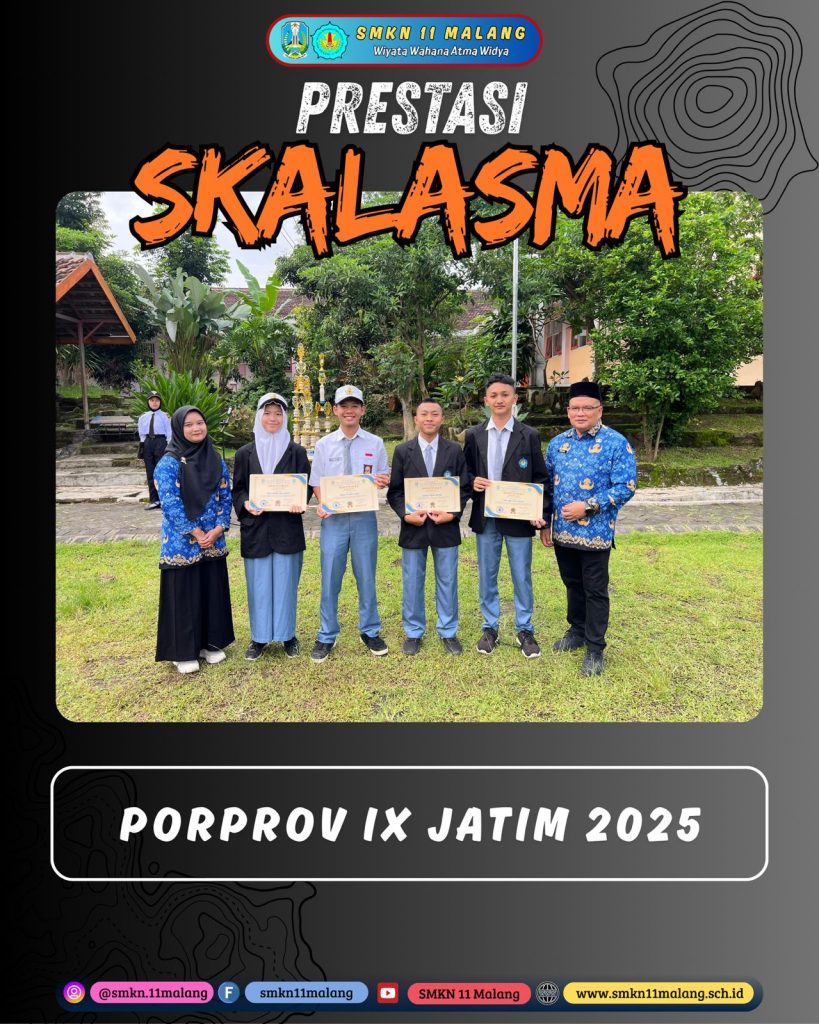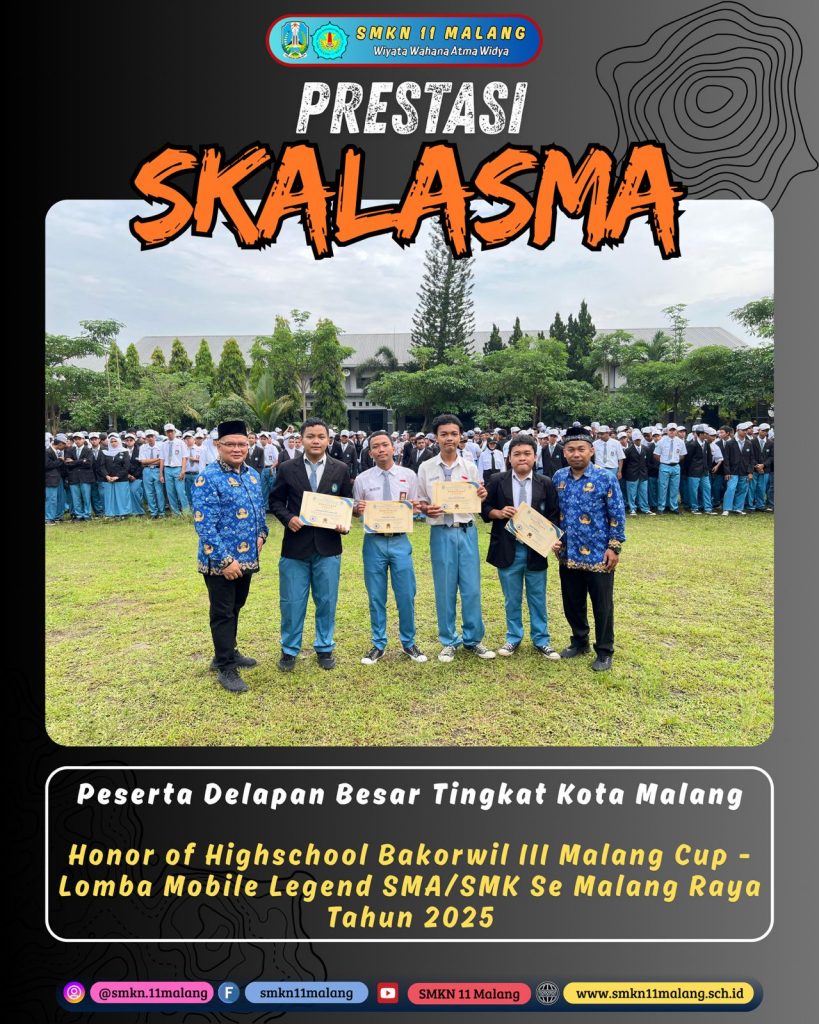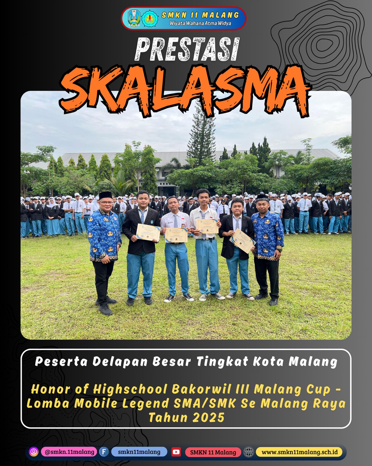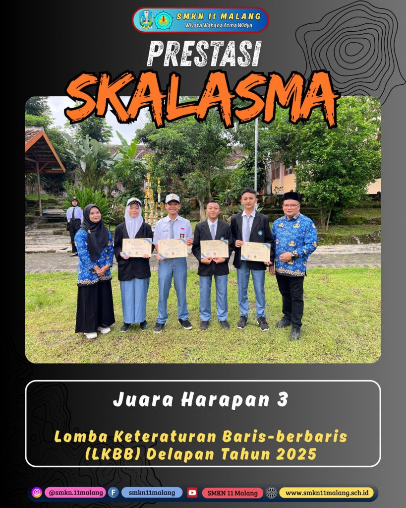 [Malang] Keluarga Besar SMK Negeri 11 Malang dengan bangga dan sukacita menyampaikan ucapan selamat serta apresiasi setinggi-tingginya kepada siswa/i yang telah menorehkan prestasi luar biasa di berbagai ajang. Prestasi ini merupakan bukti nyata dari dedikasi, kerja keras, dan semangat pantang menyerah yang dimiliki oleh siswa/i terbaik kami sebagai berikut: