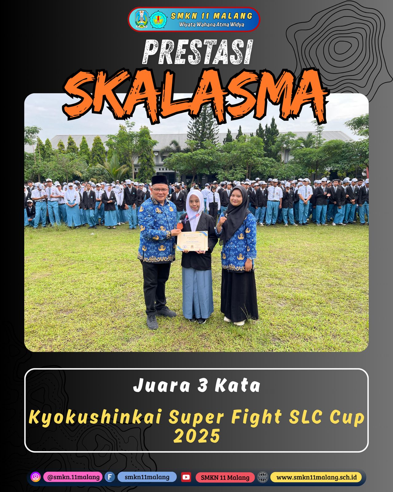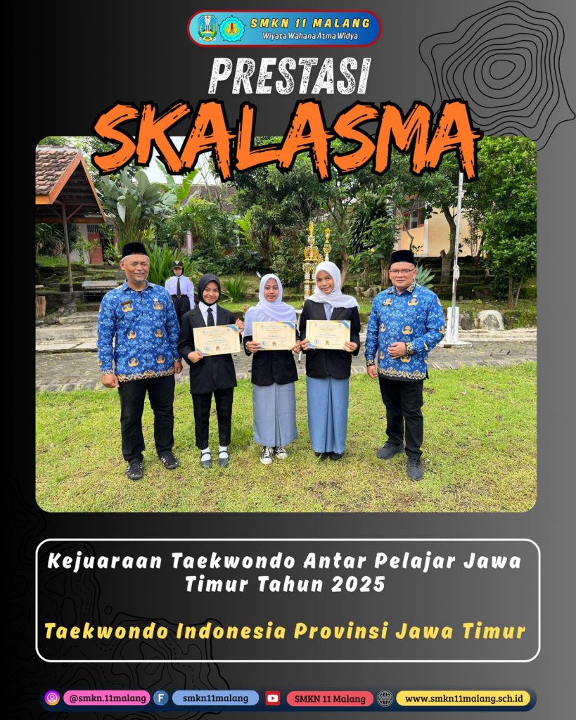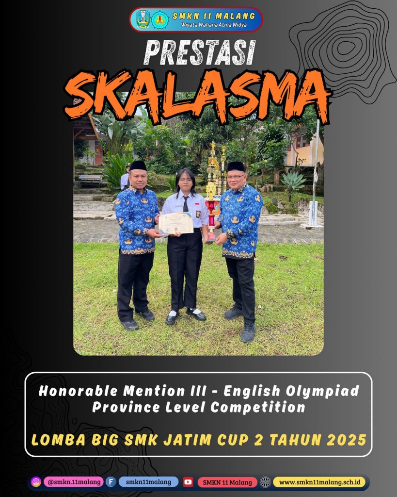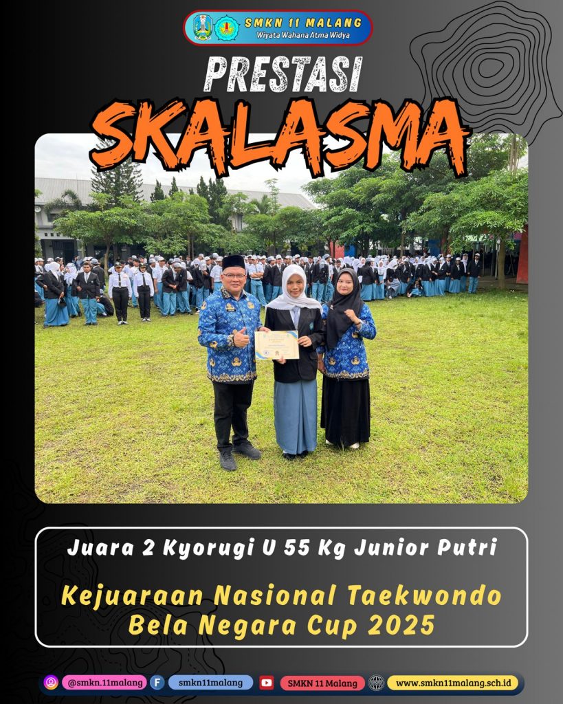[Malang] Keluarga Besar SMK Negeri 11 Malang dengan bangga dan sukacita menyampaikan ucapan selamat serta apresiasi setinggi-tingginya kepada siswa/i yang telah menorehkan prestasi luar biasa di berbagai ajang. Prestasi ini merupakan bukti nyata dari dedikasi, kerja keras, dan semangat pantang menyerah yang dimiliki oleh siswa/i terbaik kami sebagai berikut: