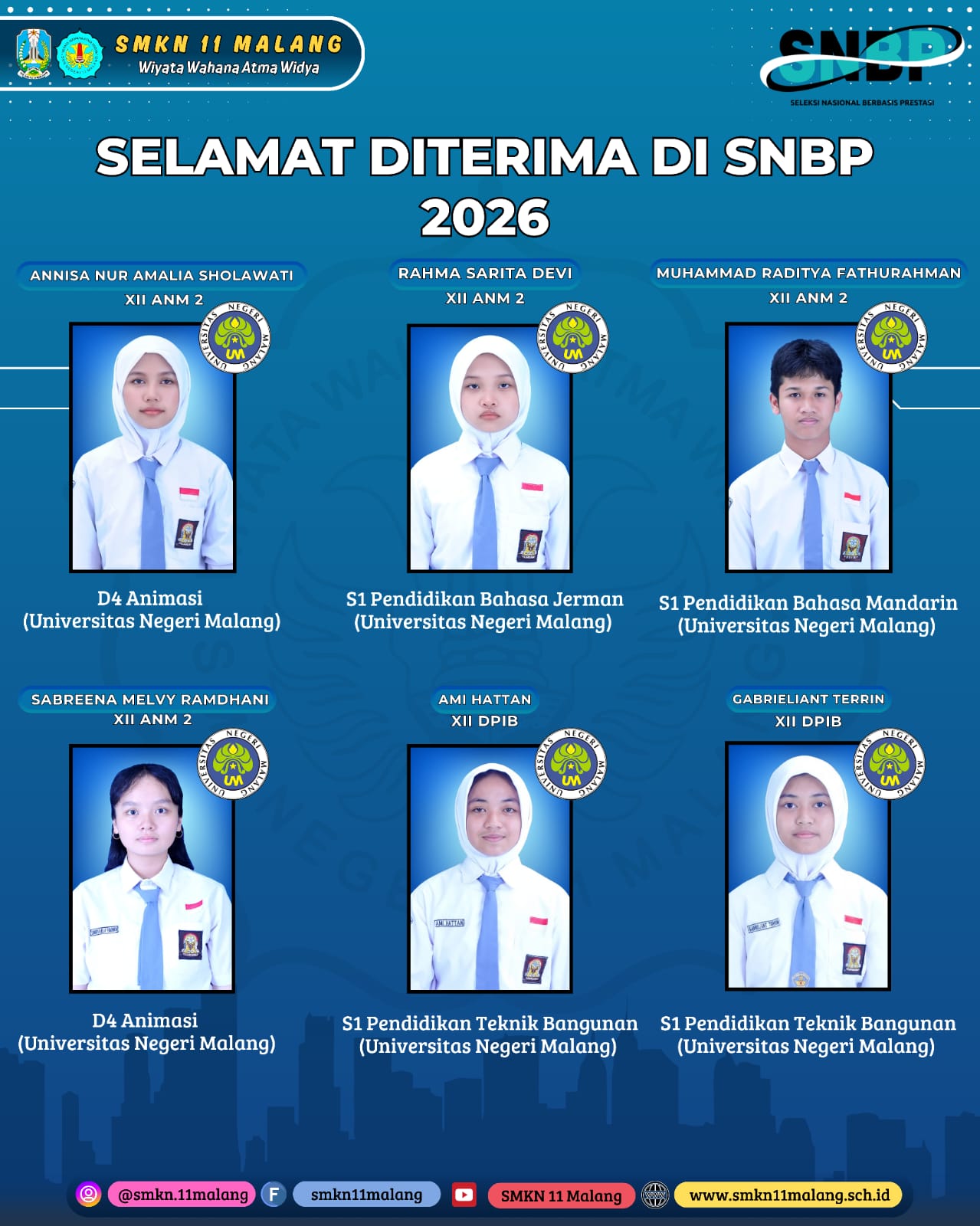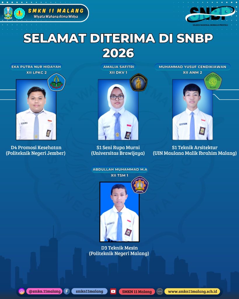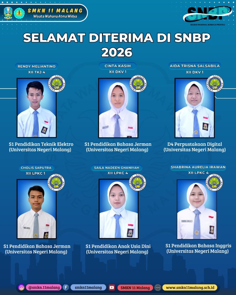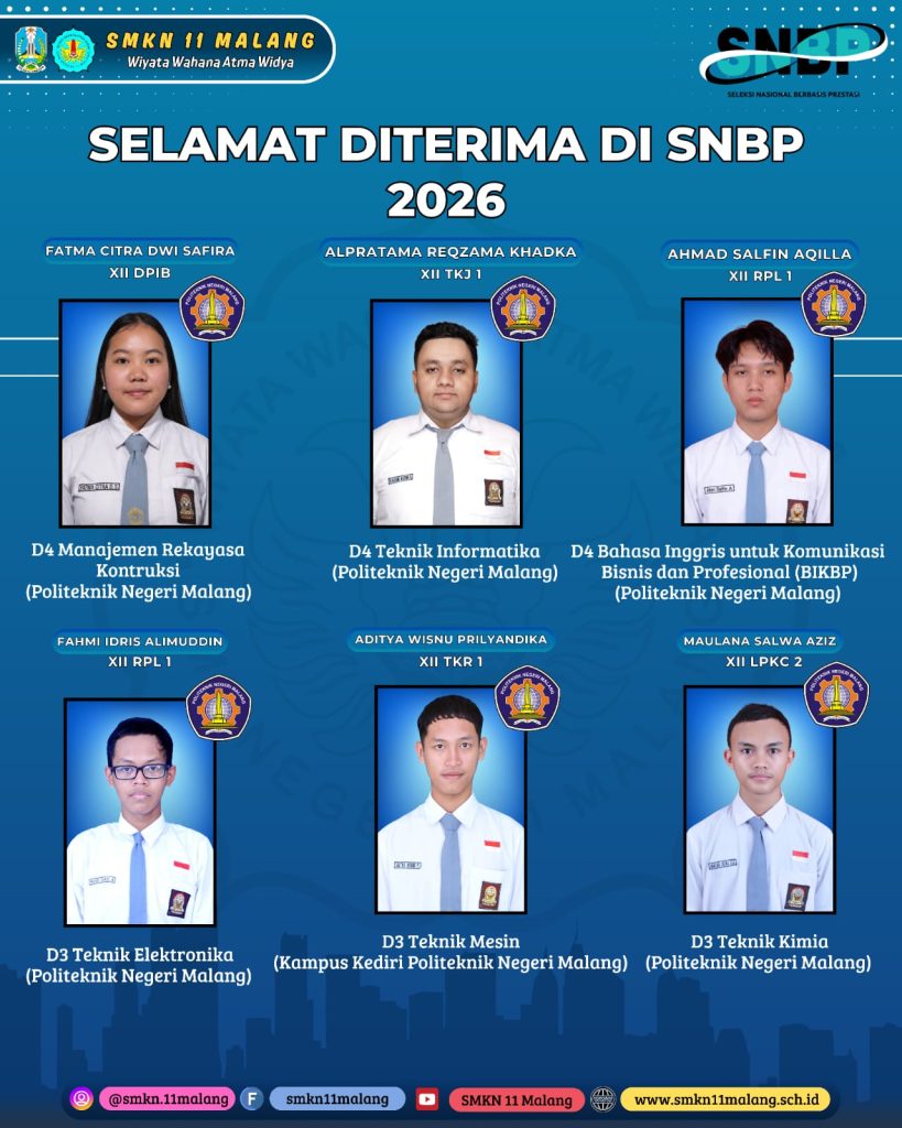 [Malang] Keluarga besar SMKN 11 Malang mengucapkan selamat dan apresiasi setinggi-tingginya kepada 22 siswa yang telah berhasil diterima di berbagai perguruan tinggi melalui jalur Seleksi Nasional Berdasarkan Prestasi (SNBP).