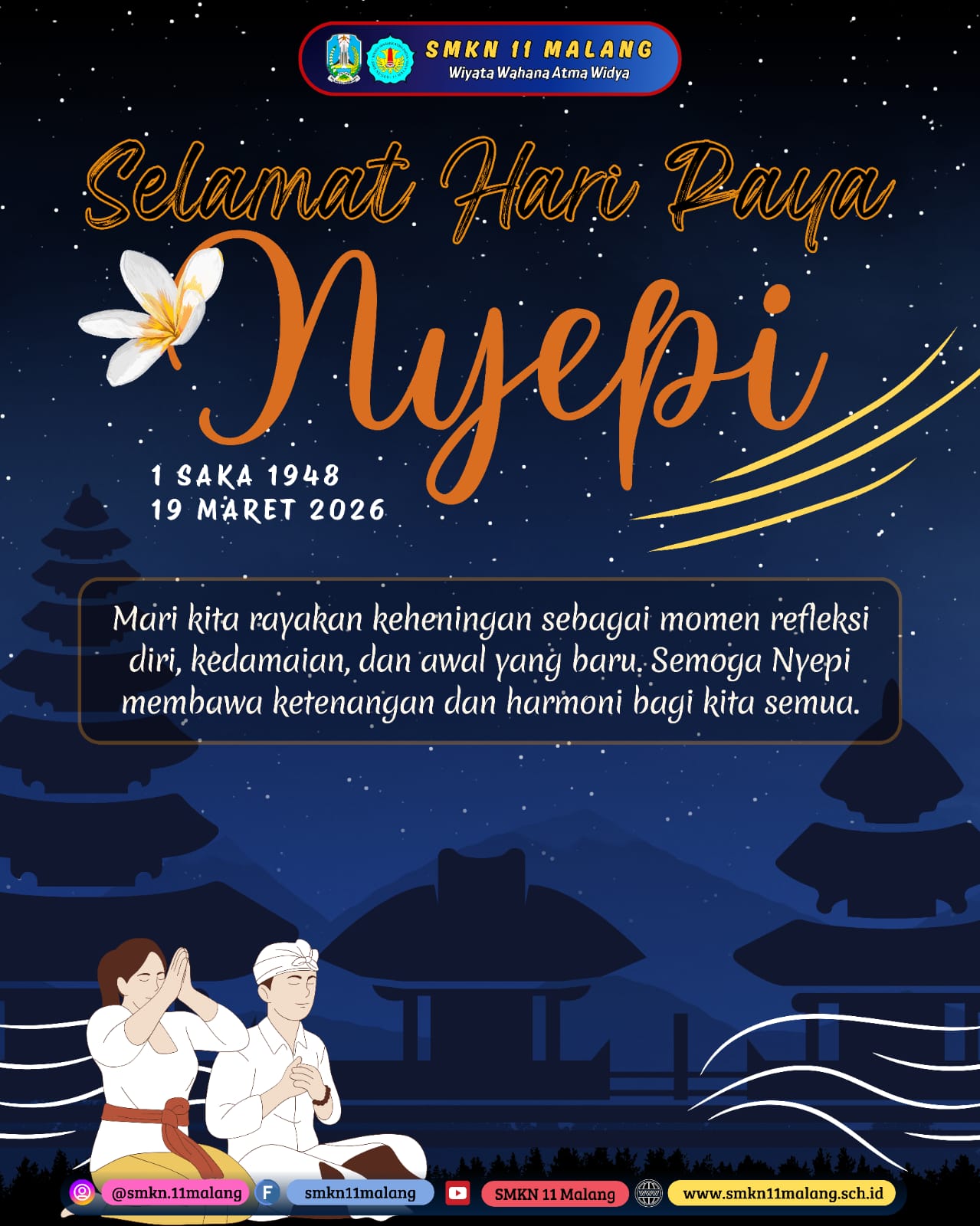 Segenap keluarga besar SMKN 11 Malang mengucapkan Selamat Hari Raya Nyepi 1 Saka 1948/19 Maret 2026. Mari kita rayakan keheningan sebagai momen refleksi diri, kedamaian, dan awal yang baru. Semoga nyepi membawa ketenangan dan harmoni bagi kita semua.